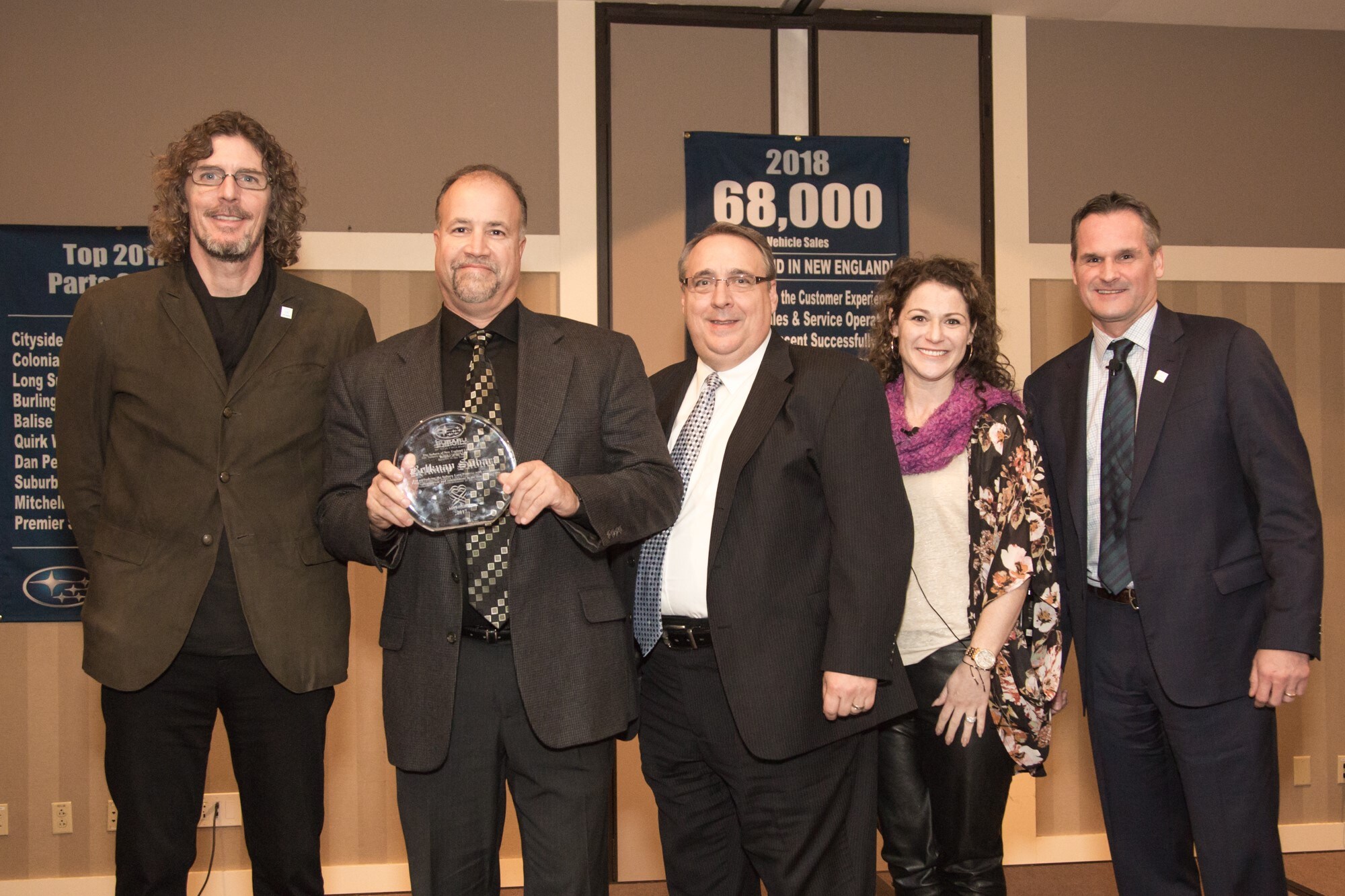 Tilton, New Hampshire 03/02/2018 - At the annual dealer meeting, in Norwood MA, Ernie Boch, Jeffrey Ruble, and Rebecca Carr, of Subaru of New England presented Belknap Subaru with its first ever, 2017 Love Promise, Dealer of the Year award! The award recognizes Belknap Subaru, for its commitment to customer service, and its work within the community it serves! Throughout the year Belknap Subaru sponsors, supports, and participates in events that are designed to strengthen Tilton, and the Lakes Region! From its work with Easter seals, Veterans Count, the Land and Lake Poker Run, The Ganong Anderson Cancer Center, The NH Humane Society, and Winnisquam Regional High School, In ways big and small, they strive to lend a hand, and a heart, whenever possible!